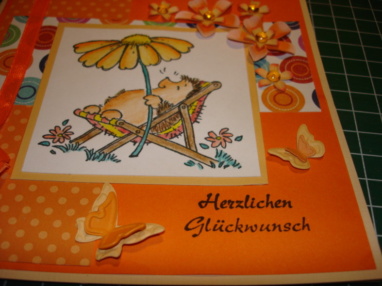 Dies ist eine Auftragskarte. Es sollte nach Möglichkeit mit einem Stuhl drauf sein und auch gerne mit Igelchen. Zufällig hatte ich gerade noch so einen Abdruck zur Hand.